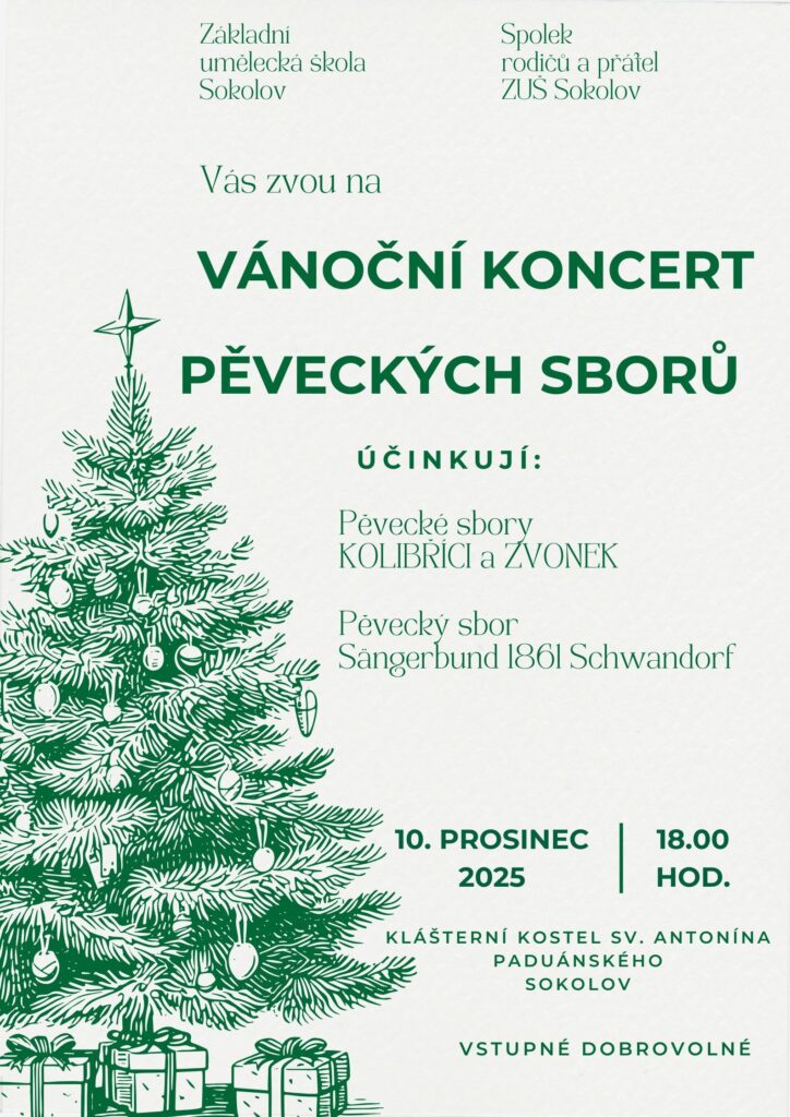 Vánoční koncert pěveckých sborů Novinky Srdečně zveme na Vánoční koncert našich pěveckých sborů ZVONEK a KOLIBŘÍCI a hostujícího sboru Sängerbund 1861 ze Schwandorfu. Koncert se uskuteční 10. prosince 2025 v Klášterním kostele sv. Antonína z Padovy a začíná v 18.00. Vstupné je doborovolné Plakát koncertu: